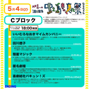 Cブロック:いいむろなおきマイムカンパニー/田川徳子/彗星マジック/匿名劇壇/喜劇結社バキュン!ズ